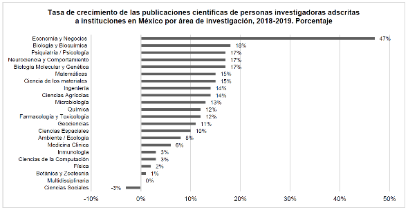 Para comprender el contexto en el que se plantea el presente programa, se presenta a continuación una breve reflexión sobre la producción científica del CIMAT, entendiendo que el avance de la ciencia se refleja naturalmente en la publicación de artículos en revistas y memorias de congresos, así como en libros y fracciones de libros especializados que sirven como base para el crecimiento y el acceso al conocimiento. En 2019, la producción de artículos científicos en México tuvo una tasa de crecimiento anual de 9.31%.(1) En el siguiente gráfico se puede observar que la mayor tasa de crecimiento anual de las publicaciones científicas de personal adscrito a instituciones mexicanas por área de investigación se dio en el campo de Economía y Negocios, con 47%, mientras que el crecimiento en el área de matemáticas fue de 15%.