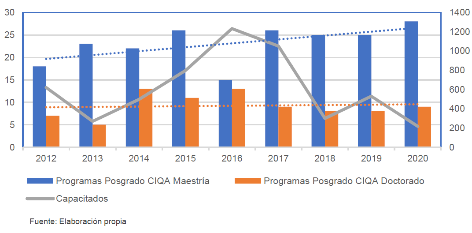 | Figura 6: Principales Indicadores CAR del Centro de Investigación en Química Aplicada (2016-2020) | Finalmente, el tema relacionado a la formación de recursos humanos, de manera específica en los programas que ofrece el CIQA, se observa una tendencia positiva en el desempeño institucional para los programas ofertados, tanto el de nivel maestría como en el de doctorado. De 2016 a 2020, se formaron un total de 74 doctores, de los cuales 47 pertenecieron al programa del propio CIQA, en tanto que el resto fueron estudiantes externos. En el mismo período, 174 maestros, de los cuales 119 fueron dentro de los programas del Centro, en tanto 2 fueron de los programas ofertados a la industria y 53 a otros programas externos. |