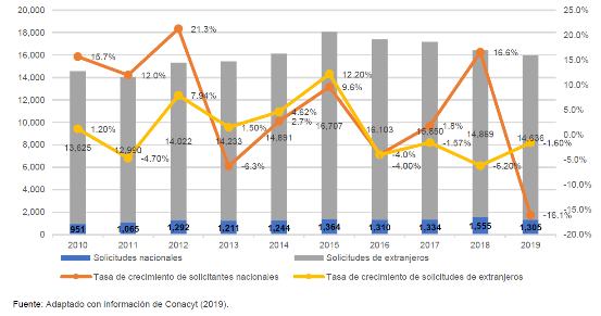 Figura 3: Solicitudes de patente en México por solicitantes nacionales y extranjeros y sus tasas de
