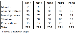 | El Centro, está conformado por 229 personas, de las cuales 163 corresponden al personal científico y tecnológico, en tanto que el personal administrativo se compone por 35 a los cuales se suman seis mandos medios y superiores. Además del personal de base del CIQA, se cuenta con 25 catedráticos. En la Figura 4, se puede observar la integración del personal de los últimos cinco años. Como se puede observar, el total de personas que conforman se ha mantenido con fluctuaciones a la baja y alza relativamente pequeñas teniendo un incremento de 2.23% entre 2016 y 2020. | Figura 4: Personal del Centro de Investigación en Química Aplicada (2016-2020) |