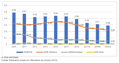 Además, una característica importante de la inversión en IDE (investigación científica y desarrollo experimental) es la proporción aportada por los sectores gubernamental y empresarial al total del GIDE. En México, la contribución del sector empresarial al GIDE siempre ha sido baja, pero a través de los años podemos observar que ha ido disminuyendo de 0.16% en el año de 2010 hasta un 0.05% en 2019. En el caso de México, los dos grandes sectores que aportan casi la totalidad del GIDE han tenido cambios importantes en su comportamiento, mientras que el gasto público del Gobierno Federal, (el que ha movido el indicador), desde 2015 se vio disminuido debido a un panorama económico adverso derivado de una alta volatilidad en los mercados financieros globales, el crecimiento negativo de la producción industrial en Estados Unidos de América, la baja en los precios del petróleo y el incremento de políticas proteccionistas en el mundo.