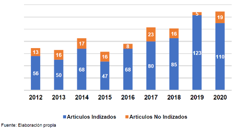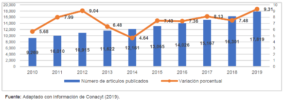 Figura 2: Publicaciones de mexicanos y crecimiento anual 2010-2019 (Volumen de producción,