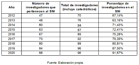 En este mismo tema, el de los recursos humanos dedicados a CyT, destaca el Sistema Nacional de Investigadores (SNI), que durante el periodo 2012-2019 alcanzó un crecimiento de 64.63% al pasar de 18,555 a 30,548 en el 2019. Respecto al área de conocimiento, en 2019, estos se agruparon de la siguiente manera: 16% en Ciencias Sociales; 15% en Ciencias Físico-Matemáticas y de la Tierra; 15% en Biología y Química; 15% en Humanidades y Ciencias de la Conducta; 15% en Ingeniería; 12% en Medicina y Ciencias de la Salud, y 12% en Biotecnología y Ciencias Agropecuarias.