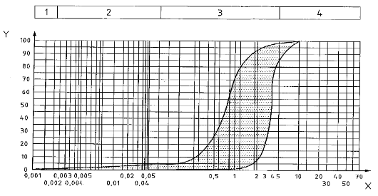 | En donde: 1. Arcilla. 2. Fango. 3. Arena. | 4. Grava. X. Arena que pasa por el tamiz, en %. Y. Peso que pasa por el tamiz, en %. |