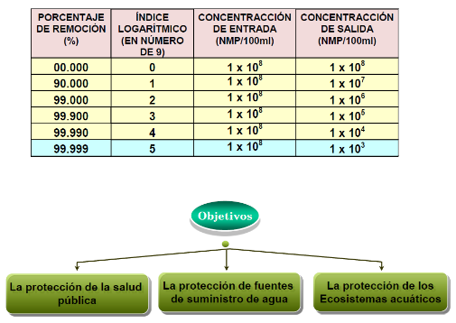 NOTA 32: Esto se debe al hecho de que, la reducción requerida de organismos indicadores normalmente está en la magnitud del 99,9% al 99,99%. Una fuga o cortocircuito del 0,01% al 0,1% de las aguas residuales o un régimen de reducción reducido de sólo el 99% en el 1% al 10% de las aguas residuales a causa de una depuración incompleta, puede hacer que se contabilicen gérmenes que ya excedían los niveles del efluente.