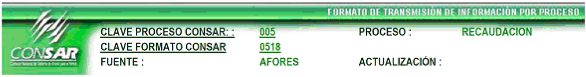 | 6 | 3 Caracteres Numéricos | Clave del formato Según CONSAR (Definido en el encabezado CLAVE FORMATO CONSAR) |