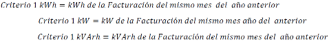 Este criterio 1 consiste en utilizar el consumo registrado por el "USUARIO DE SUMINISTRO BÁSICO" en el mismo periodo del mes del año anterior, facturado y medido en kilowatt-hora (kWh), kilowatt (kW) y kilo voltio-amperio reactivo hora (kVArh).