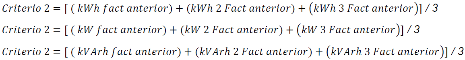 El criterio 2 consiste en la suma de los consumos de energía eléctrica registrados en las últimas tres Facturaciones anteriores a la actual dividas entre tres para obtener un promedio, y es utilizado cuando no se cuenta con el correlativo a la facturación del año anterior. De igual forma, es facturado y medido en kilowatt-hora (kWh), kilowatt (kW) y kilo voltio-amperio reactivo hora (kVArh).