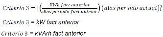 El criterio 3 consiste en utilizar el consumo promedio diario de la anterior Facturación, siempre y cuando se trate de medición real y se utiliza cuando no se cuenta con la Facturación del año anterior ni con al menos tres Facturaciones anteriores. De igual forma, es facturado y medido en kilowatt-hora (kWh), Kilowatt (kW) y kilo voltio-amperio reactivo hora (kVArh).