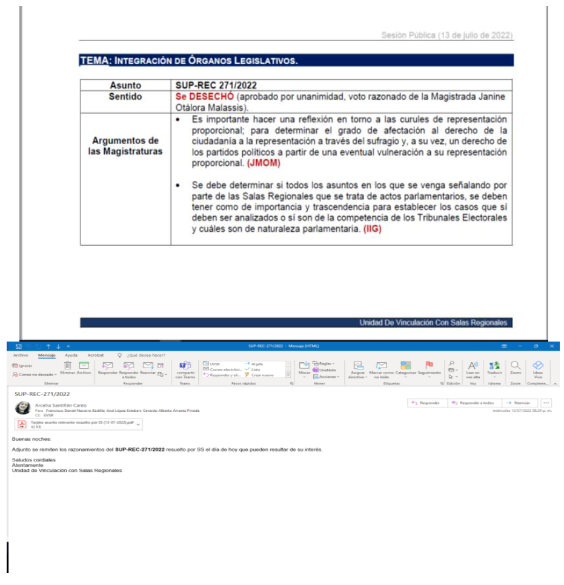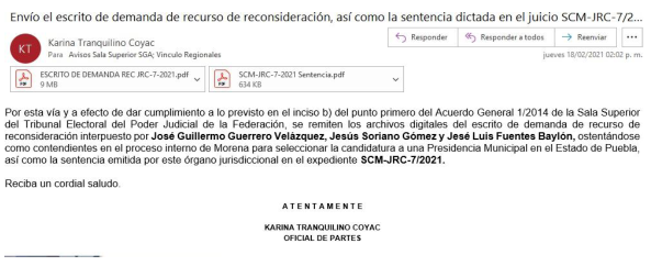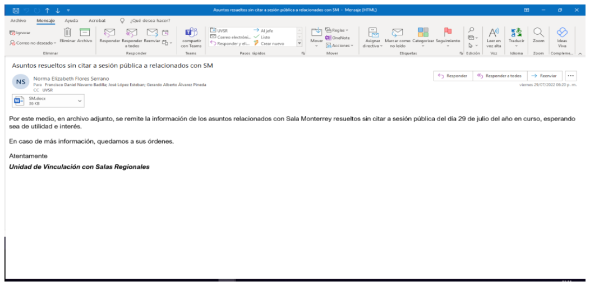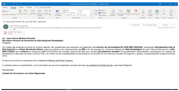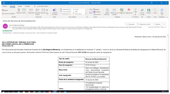 Ilustración 34. Modelo de correo remitido por alguna sala regional para avisar un medio de impugnación