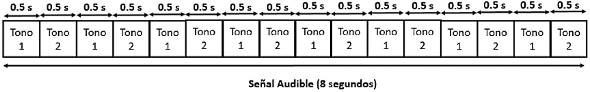 | 4.4 | Señal audible y cadencia de vibración del Mensaje de Alerta en el Equipo Terminal Móvil Los ETM deberán reproducir la Señal Audible y la cadencia de vibración únicamente al mostrar la ventana emergente o pop-up con el Mensaje de Alerta siguiendo la secuencia mostrada en las Figuras 1 y 2 respectivamente. I. El tono 1 se conformará de las frecuencias 932.33 Hz, 1 046.5 Hz y 3 135.96 Hz modulado a 7 271.96 Hz. II. El tono 2 se conformará de las frecuencias 440 Hz, 659.26 Hz y 3 135.96 Hz modulado a 1 099.26 Hz. La cadencia de vibración deberá ser reproducida observando lo establecido en la Tabla 6. NOTA: La Señal Audible y la cadencia de vibración pueden o no reproducirse de manera sincronizada. Lo anterior se verifica con el método de prueba 5.6. | |