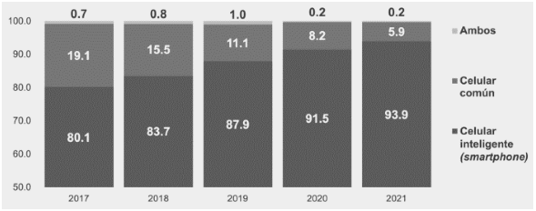 En ese orden de ideas, la ENDUTIH señaló como se muestra a continuación, que entre 2017 y 2021, los usuarios que dispusieron de un ETM tipo teléfono inteligente crecieron 13.8 puntos porcentuales, al pasar de 80.1 a 93.9 por ciento.