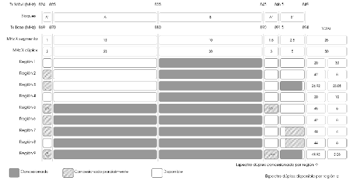 | Consideraciones adicionales: | Su concesionamiento se encontrará sujeto al espectro radioeléctrico disponible en esta Banda de Frecuencias y en las zonas geográficas que se determinen. |