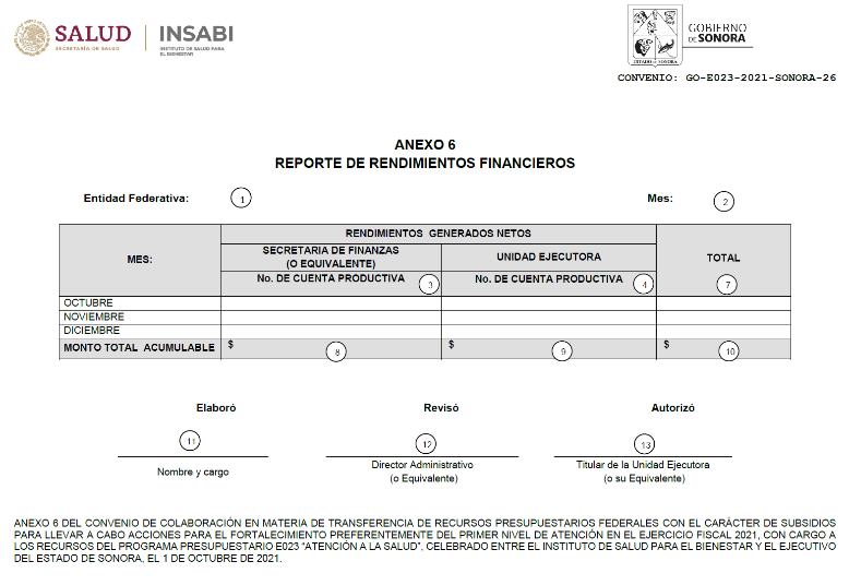 "LA ENTIDAD" presentará un reporte de los rendimientos financieros que generen los recursos presupuestarios federales transferidos en virtud del presente instrumento jurídico, conforme al Anexo 6 de este Convenio de Colaboración.