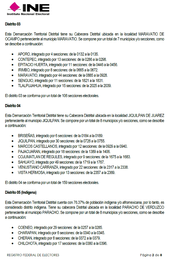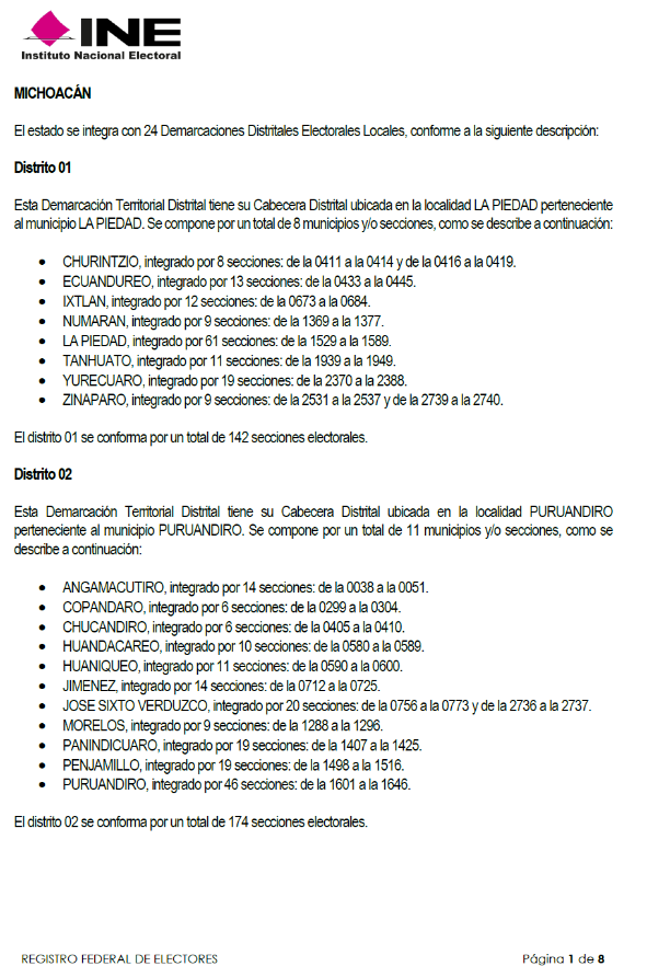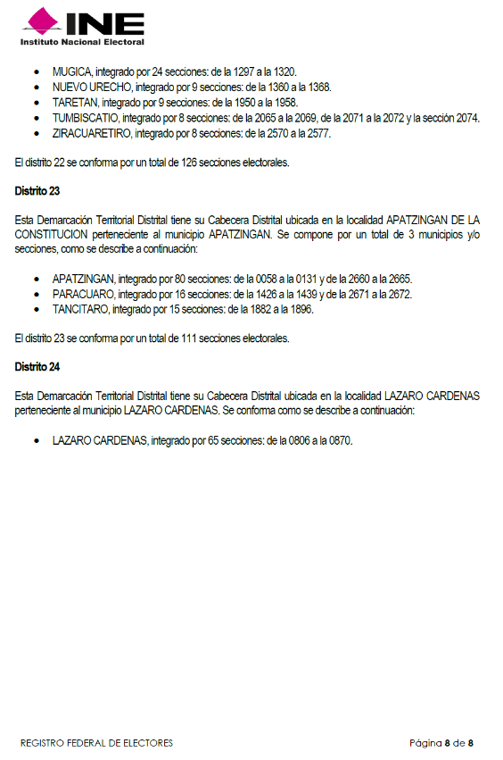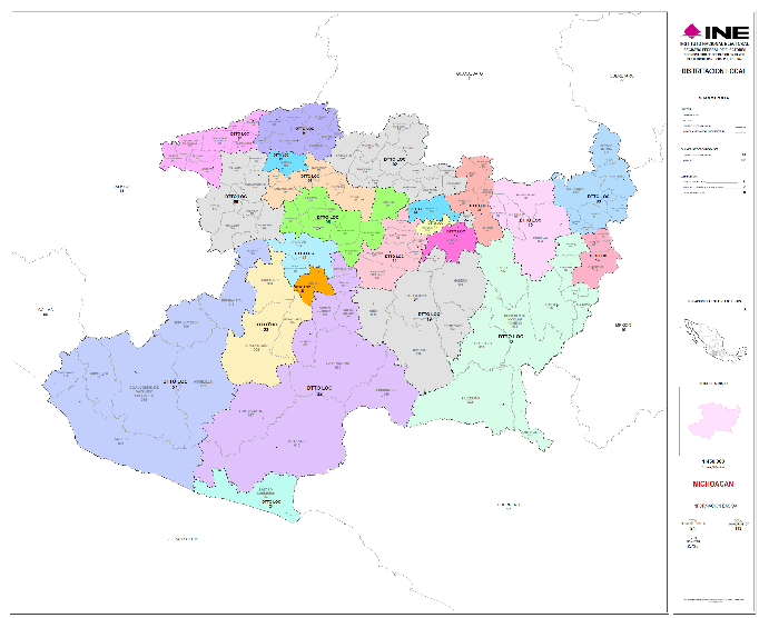 En virtud de lo expuesto, y de acuerdo con el PTDN21-23, se realizaron las actividades para la generación del proyecto de demarcación territorial de los distritos electorales uninominales locales en que se divide el Estado de Michoacán y sus respectivas cabeceras distritales, a propuesta de la JGE.