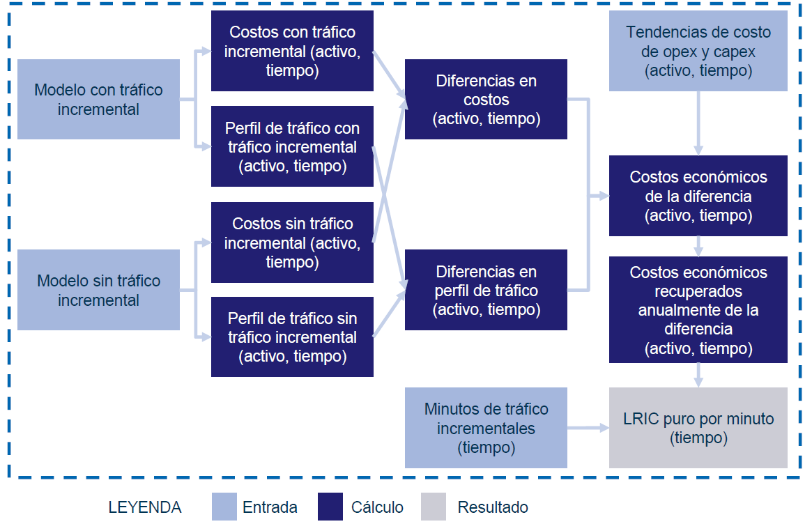 Ahora bien, para efectos de la determinación de la tarifa aplicable por servicios de terminación en la red móvil del AEP, se elaboró un modelo de costos en el que se empleó una Metodología de Costo Incremental de Largo Plazo Puro y se incorporaron diversas variables como usuarios, tráfico, espectro, entre otras, representativas del mencionado agente.