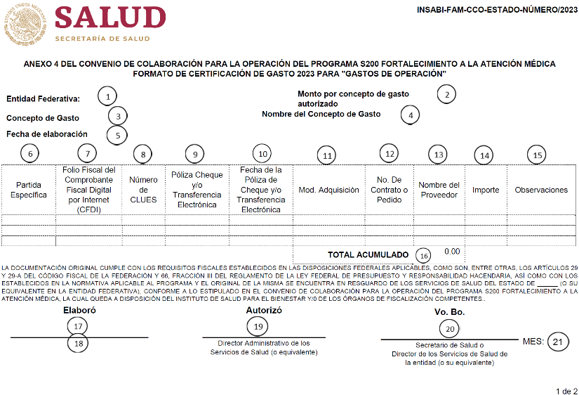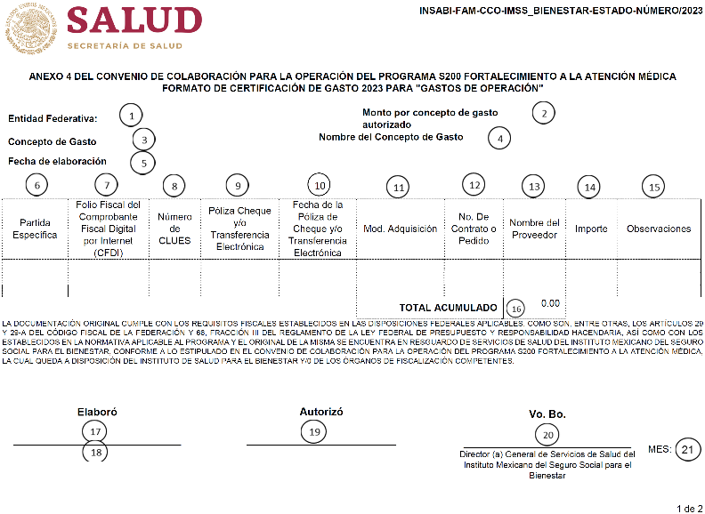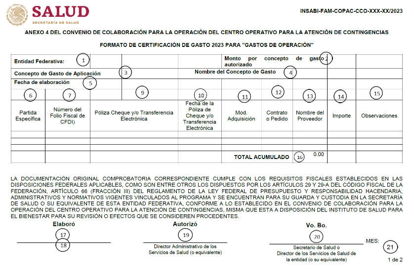 | 29 | Nombre y firma del/de la Secretario(a) de Salud, quien Certifica la comprobación del gasto de conformidad con la normatividad aplicable. |