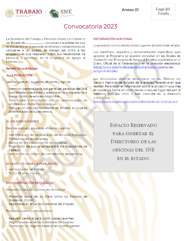 El Programa de Apoyo al Empleo se conforma por dos subprogramas: Intermediación Laboral y Movilidad Laboral; cinco servicios auxiliares: SNETEL, Observatorio Laboral, Talleres para Buscadores de Empleo y Talleres para Empleadores; y la estrategia transversal Abriendo Espacios, por medio de los cuales, con recursos públicos federales, se atiende a buscadores de trabajo y empleadores, para facilitar la articulación del mercado laboral.