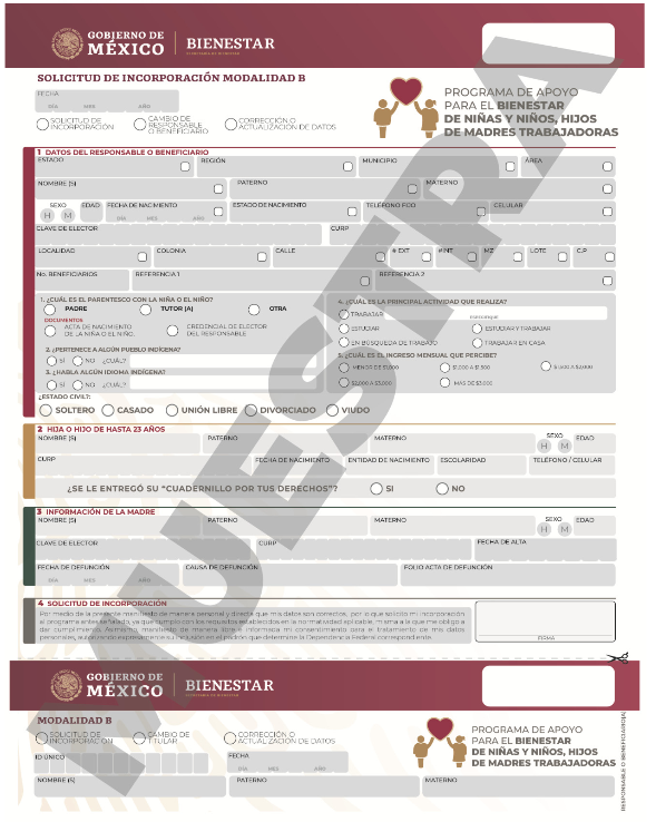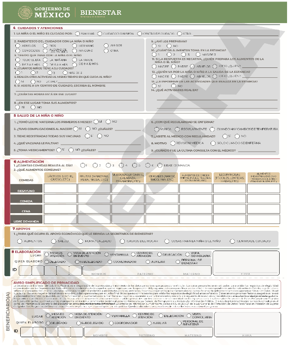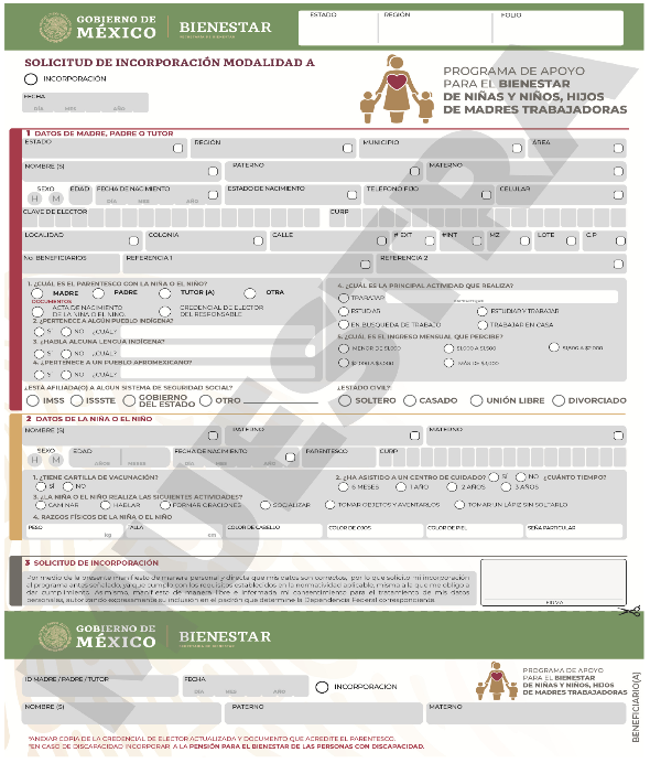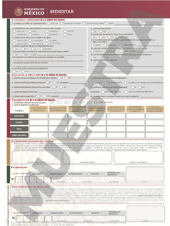 | Apoyo económico bimestral, por cada niña o niño. | $1,600.00 M.N. | Madre, padre o tutor con niña(s) y niño(s) a su cargo de recién nacidos hasta un día antes de cumplir los 4 años de edad. |