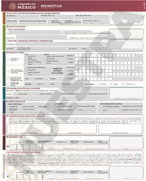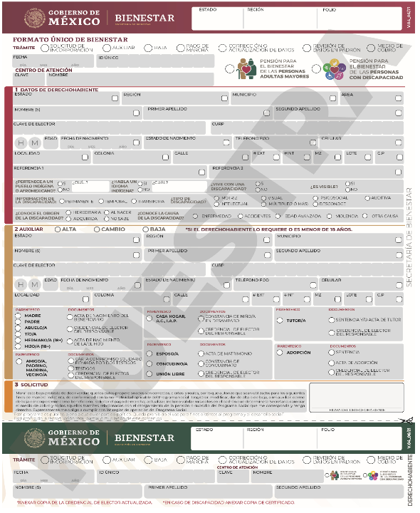 Cualquier trámite relativo a la pensión por parte de la persona derechohabiente o de su persona adulta auxiliar, deberá realizarse a través del Formato Único de Bienestar (Anexo 2 de las presentes Reglas de Operación), acompañado de la documentación requerida de acuerdo con lo establecido en el numeral 3.3.2 de las mismas Reglas. Los trámites podrán realizarse durante cualquier momento del ejercicio fiscal.