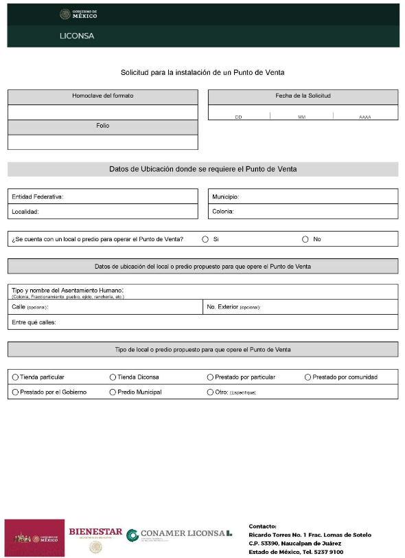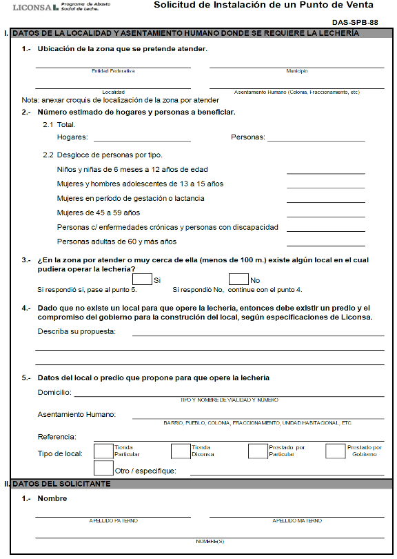 Estudio de factibilidad.- Formato para recopilar datos relevantes acerca de la cantidad potencial de personas beneficiarias, la disponibilidad de local, la ubicación de la zona en donde se requiere instalar un nuevo punto de venta, etc., que sirve para dictaminar la procedencia o no de su instalación. Se puede consultar en el Manual de Procedimiento para la Apertura, Reubicación y Cierre de Lecherías, el cual se encuentra la página electrónica www.gob.mx/liconsa.