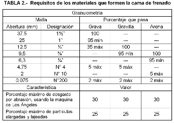 Parte de la rampa de emergencia para frenado que propiamente detiene el vehículo con el material granular suelto que se coloca en su superficie. La configuración de la cama de frenado determina los tres tipos de rampas definidos en los incisos 4.10. a 4.12. e ilustrados en la figura 2.