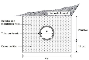 6.5.3.1. El subdrén debe consistir en tubos perforados de concreto o de policloruro de vinilo (PVC), con diámetro interno (i) mínimo de quince (15) centímetros, dentro de una zanja con las dimensiones que se muestran en la figura 5 y sobre una cama de quince (15) centímetros de espesor como mínimo, formada con el material de filtro que se utilice para el relleno de la zanja. Los tubos y el material de filtro deben cumplir con los requisitos de calidad que se establezcan en el proyecto ejecutivo.