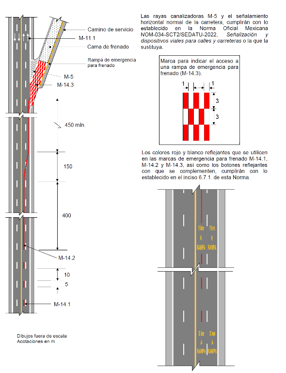 El señalamiento horizontal de rampas de emergencia para frenado se debe hacer mediante marcas especiales pintadas o colocadas en el pavimento, tanto en tangentes como en curvas, denominadas Marcas de emergencia para frenado (M-14). En la entrada a la rampa y diferenciando claramente el arroyo vial de la carretera para evitar que los vehículos fuera de control continúen por él, se deben utilizar rayas canalizadoras (M-5) conforme a lo indicado en la Norma Oficial Mexicana NOM-034-SCT2/SEDATU-2022, Señalización y dispositivos viales para calles y carreteras o la que la sustituya, como se muestra en la figura 6. Las marcas de emergencia para frenado son: