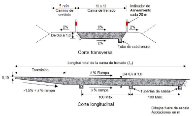 Es una franja auxiliar conectada al arroyo vial especialmente acondicionada para disipar la energía cinética de los vehículos que queden fuera de control por fallas mecánicas, principalmente en sus sistemas de frenos, desacelerándolos en forma controlada y segura, mediante el uso de materiales granulares sueltos y aprovechando, en su caso, la acción de la gravedad. Como se muestra en la figura 1, las rampas de emergencia para frenado constan de: acceso, cama de frenado y camino de servicio.