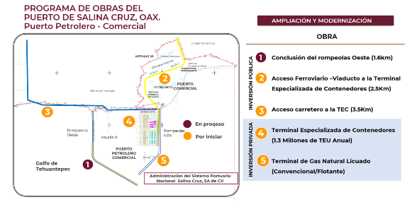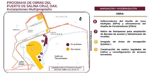 De este modo, el puerto de Salina Cruz apoyará adecuadamente el crecimiento de la actividad económica, del comercio exterior e interior, las inversiones y la creación de bienestar en el Sur - Sureste del país integrándose efectivamente al Programa para el Desarrollo del Istmo de Tehuantepec promovido por la actual Administración Federal.