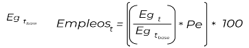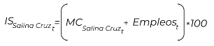 | Método de cálculo | Donde: | | = | Incremento en el empleo en ASIPONA Salina Cruz | | | = | Empleos generados en el año t | | | = | Empleos generados en el año base (2019) | | | = | Ponderador del empleo | | | = | Año de observación | | | = | Año base de referencia correspondiente a los datos de registrados en 2019 | | | | | |