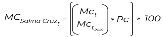 | Método de cálculo | Donde: | | = | Movimiento de carga portuaria en ASIPONA Salina Cruz | | | = | Movimiento de carga portuaria en el año t | | | = | Movimiento de carga portuaria en el año base (2018) | | | = | Ponderador de carga | | | = | Año de observación | | | = | Año base de referencia correspondiente a los datos de registrados en 2018 | | | | | |