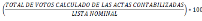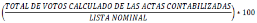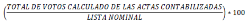 | TOTAL_VOTOS_CALCULADO | CARACTERES NUMÉRICOS SIN COMAS NI DECIMALES., O EN SU CASO, CARACTERES ALFABÉTICOS, TRATÁNDOSE DE LOS SUPUESTOS DE SIN ACTA, ILEGIBLE O SIN DATO | SUMA DE LOS VOTOS ASENTADOS EN LOS CAMPOS ASIGNADOS EN LAS ACTAS PREP, PARA LOS PARTIDOS POLÍTICOS Y LAS CANDIDATURAS, SEAN ESTAS INDEPENDIENTES, POR PARTIDO POLÍTICO, CANDIDATURA COMÚN (EN EL SUPUESTO DE QUE LA LEGISLACIÓN LOCAL LA CONTEMPLE) O POR COALICIÓN EN CUALQUIERA DE SUS COMBINACIONES, SEGÚN SEA EL CASO; TOTAL DE VOTOS NULOS Y, EN SU CASO, TOTAL DE VOTOS PARA CANDIDATURAS NO REGISTRADAS. EL TOTAL DE VOTOS SE CALCULA MEDIANTE LA SUMA QUE REALIZA AUTOMÁTICAMENTE EL SISTEMA INFORMÁTICO DEL PREP. PARA LA INCONSISTENCIA "EXCEDE LISTA NOMINAL", SE DEBE DE REALIZAR EL CÁLCULO CORRESPONDIENTE, INCLUSO CUANDO EL RESULTADO SEA MAYOR A LA LISTA NOMINAL Y MOSTRAR EL VALOR ARROJADO DEL TOTAL DE VOTOS. PARA LOS SUPUESTOS "TODOS ILEGIBLES Y/O SIN DATO", SE DEBE MOSTRAR EL VALOR: 0 PARA LOS SUPUESTOS "SIN ACTA", SE DEBE MOSTRAR EL VALOR: "SIN ACTA" |