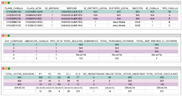 | C_P1_P2 | CARACTERES NUMÉRICOS SIN COMAS NI DECIMALES, O EN SU CASO, "SIN ACTA", "ILEGIBLE" O "SIN DATO" CUANDO SE TRATE DE DICHOS SUPUESTOS.CARACTERES ALFABÉTICOS, TRATÁNDOSE DE LOS SUPUESTOS DE SIN ACTA, ILEGIBLE O SIN DATO | NÚMERO DE VOTOS PARA LAS COALICIONES QUE, EN SU CASO SE REGISTREN, Y EL NÚMERO DE VOTOS POR CADA COMBINACIÓN DERIVADA DE ÉSTAS LAS COALICIONES QUE, EN SU CASO, SE REGISTREN. PARA EL CASO DE UNA COALICIÓN DE TRES PARTIDOS (P1, P2, PX), LAS COMBINACIONES CORRESPONDIENTES PARA LOS ENCABEZADOS DE LOS CAMPOS SON: C_P1_P2_PX C_P1_P2 C_P1_PX C_P2_PX C_P1_P2_PX |