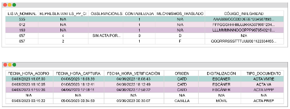| Título I Disposiciones Generales Capítulo Único Glosario 1. Para los efectos del presente Anexo, se entenderá por: I. Acta PREP: primera copia del acta de escrutinio y cómputo destinada para el PREP, o en ausencia de ésta, cualquier copia del acta de escrutinio y cómputo. II. AEC: Acta de Escrutinio y Cómputo. III. CATD: Centro de Acopio y Transmisión de Datos. IV. CCV: Centro de Captura y Verificación. V. CSV: (comma-separated values): es un tipo de archivo de texto plano que permite el intercambio de información entre algunas aplicaciones de datos. En los archivos CSV la información se organiza de forma tabular. Cada línea del archivo es un registro y cada registro consiste en uno o más campos (columnas) separados por un carácter delimitador. VI. Difusor oficial: institución académica o medio de comunicación internacional, nacional, estatal o regional, que cumple con los requisitos técnicos y de infraestructura mínimos necesarios para la publicación de los resultados electorales preliminares, de acuerdo a los requerimientos establecidos por el Instituto o los OPL. VII. Hash o Código de integridad: es un valor alfanumérico de representación único que permite identificar a cada imagen del Acta PREP digitalizada, con el cual se verifica su integridad. Dicho valor es obtenido a partir de algún algoritmo criptográfico denominado comúnmente funciones hash. Ejemplo de funciones hash es sha256. VIII. Proceso técnico operativo: conjunto de actividades y procedimientos secuenciados para llevar a cabo desde el acopio de las Actas PREP hasta la publicación de los datos, imágenes y bases de datos, así como el empaquetado de las Actas PREP. IX. Pruebas: aquellas actividades que se llevan a cabo para verificar el funcionamiento del sistema informático. X. Simulacro: evento previo al día de la Jornada Electoral, en que se reproducen las fases del proceso técnico operativo, para evaluar el óptimo funcionamiento del sistema informático y los procedimientos. XI. Sistema informático: conjunto de programas e infraestructura tecnológica utilizados para el acopio y digitalización de las Actas PREP, así como para la captura, verificación y publicación de los datos asentados en las Actas PREP y las imágenes de las mismas. | Título I Disposiciones Generales Capítulo Único Glosario 1. Para los efectos del presente Anexo, se entenderá por: I. Acta PREP: primera copia del acta de escrutinio y cómputo destinada para el PREP, o en ausencia de ésta, cualquier copia del acta de escrutinio y cómputo. II. AEC: Acta de Escrutinio y Cómputo. III. CATD: Centro de Acopio y Transmisión de Datos. IV. CCV: Centro de Captura y Verificación. V. CSV: (comma-separated values): es un tipo de archivo de texto plano que permite el intercambio de información entre algunas aplicaciones de datos. En los archivos CSV la información se organiza de forma tabular. Cada línea del archivo es un registro y cada registro consiste en uno o más campos (columnas) separados por un carácter delimitador. VI. Difusor oficial: institución académica o medio de comunicación internacional, nacional, estatal o regional, que cumple con los requisitos técnicos y de infraestructura mínimos necesarios para la publicación de los resultados electorales preliminares, de acuerdo con los requerimientos establecidos por el Instituto o los OPL. VII. Hash o Código de integridad: es un valor alfanumérico de representación único que permite identificar a cada imagen del Acta PREP digitalizada, con el cual se verifica su integridad. Dicho valor es obtenido a partir de algún algoritmo criptográfico denominado comúnmente función hash. Ejemplo de función funciones hash es sha256. VIII. Proceso técnico operativo: conjunto de actividades y procedimientos secuenciados para llevar a cabo desde el acopio de las Actas PREP hasta la publicación de los datos, imágenes y bases de datos, así como el empaquetado de las Actas PREP. IX. Pruebas: aquellas actividades que se llevan a cabo para verificar el funcionamiento, capacidad, continuidad y seguridad del sistema informático. X. Simulacro: evento previo al día de la Jornada Electoral, en que se reproducen las fases del proceso técnico operativo, para evaluar el óptimo funcionamiento del sistema informático y los procedimientos. XI. Sistema informático: conjunto de programas e infraestructura tecnológica utilizados para el acopio y digitalización de las Actas PREP, así como para la captura, verificación y publicación de los datos asentados en las Actas PREP y las imágenes de las mismas. |
