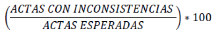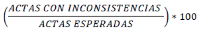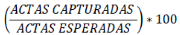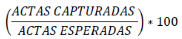 | PORCENTAJE_ACTAS_ CAPTURADAS | CARACTERES NUMÉRICOS. SE SEPARAN LOS ENTEROS Y DECIMALES MEDIANTE UN PUNTO. LOS DECIMALES DEBEN EXPRESARSE A CUATRO POSICIONES | PORCENTAJE DE ACTAS PREP CAPTURADAS AL MOMENTO DEL CORTE DE INFORMACIÓN, CALCULADO RESPECTO DEL TOTAL DE ACTAS ESPERADAS. LOS DECIMALES SON EXPRESADOS A CUATRO POSICIONES, AUN CUANDO ESTOS TERMINEN EN CERO. EL DECIMAL DE LA CUARTA POSICIÓN DEBERÁ TRUNCARSE Y NO REDONDEARSE. LA FÓRMULA PARA OBTENER EL PORCENTAJE DE ACTAS PREP CAPTURADAS ES LA SIGUIENTE: ![]() EJEMPLO DE FORMATO: 85.0052 |
