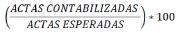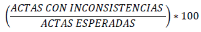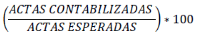 | PORCENTAJE_ACTAS_ CONTABILIZADAS | CARACTERES NUMÉRICOS. SE SEPARAN LOS ENTEROS Y DECIMALES MEDIANTE UN PUNTO. LOS DECIMALES DEBEN EXPRESARSE A CUATRO POSICIONES | PORCENTAJE DE ACTAS PREP CALCULADO RESPECTO DEL TOTAL DE ACTAS ESPERADAS QUE, AL MOMENTO DEL CORTE DE INFORMACIÓN, HAN SIDO CONTABILIZADAS. LOS DECIMALES SON EXPRESADOS A CUATRO POSICIONES AUN CUANDO ÉSTOS TERMINEN EN CERO Y EL DECIMAL DE LA CUARTA POSICIÓN DEBERÁ TRUNCARSE Y NO REDONDEARSE. LA FÓRMULA PARA OBTENER EL PORCENTAJE DE ACTAS PREP CONTABILIZADAS ES LA SIGUIENTE: ![]() EJEMPLO DE FORMATO: 89.0187 |
