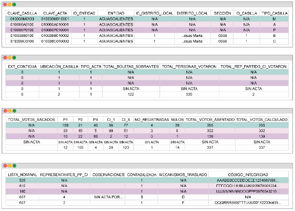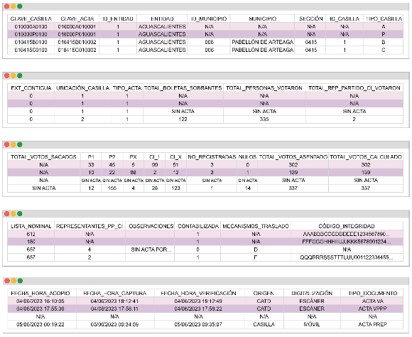 | TIPO_DOCUMENTO | · ACTA PREP · RPP · CC · PPC · N/A | TIPO DE ACTA PREP DIGITALIZADA: · ACTA PREP: SI SE DIGITALIZA EL ACTA PREP · RPP: SI SE DIGITALIZA UNA COPIA DEL ACTA DE ESCRUTINIO Y CÓMPUTO CORRESPONDIENTE A LAS REPRESENTACIONES LOS REPRESENTANTES DE PARTIDOS POLÍTICOS · CC: SI SE DIGITALIZA UNA COPIA OBTENIDA DEL CONSEJO · PPC SI SE DIGITALIZÓ UNA COPIA DE LAS REPRESENTACIONES LOS REPRESENTANTES DE PARTIDOS POLÍTICOS OBTENIDA DEL CONSEJO PARA LOS SUPUESTOS SIN ACTA ESTE CAMPO SE MARCARÁ CON UN N/A. LAS SIGLAS N/A REPRESENTAN: NO APLICA. |