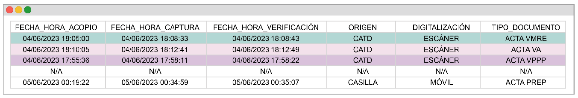 | FECHA_HORA_ACOPIO | DD/MM/AAAA HH:MM:SS | PARA EL ACTA PREP DIGITALIZADA EN CATD: FECHA Y HORA DE RECEPCIÓN DE LA BOLSA DEL SOBRE PREP CON LA COPIA DEL ACTA EN EL CATD. PARA EL ACTA PREP DIGITALIZADA DESDE LA CASILLA: FECHA Y HORA QUE REGISTRE EL SISTEMA INFORMÁTICO AL MOMENTO DE DIGITALIZAR EL ACTA PREP MEDIANTE EL APLICATIVO DE DIGITALIZACIÓN DE ACTAS PARA DISPOSITIVOS MÓVILES. EL FORMATO PARA FECHA DEBE SER A DOS DÍGITOS PARA DÍA, DOS DÍGITOS PARA MES Y CUATRO DÍGITOS PARA EL AÑO. EL FORMATO DE HORA DEBE SER HORA A DOS DÍGITOS, MINUTOS A DOS DÍGITOS Y SEGUNDOS A DOS DÍGITOS. LA HORA SIEMPRE EN FORMATO DE 24 HORAS Y DE ACUERDO CON EL HUSO HORARIO DE LA ENTIDAD, DE CONFORMIDAD CON LA HORA OFICIAL EN LOS ESTADOS UNIDOS MEXICANOS Y LOS HUSOS HORARIOS ESTABLECIDOS POR EL CENTRO NACIONAL DE METROLOGÍA. ASIMISMO, EL SISTEMA INFORMÁTICO DEBE CONTAR CON LOS MECANISMOS QUE ASEGUREN QUE EL REGISTRO DE LA FECHA Y HORA DE ACOPIO CORRESPONDA AL PERIODO DE LA OPERACIÓN DEL PREP. EJEMPLO DE FORMATO Ejemplo de formato: 04/06/2023 20:00:00 PARA LOS SUPUESTOS SIN ACTA ESTE CAMPO SE MARCARÁ CON UN N/A. LAS SIGLAS N/A REPRESENTAN: NO APLICA. |