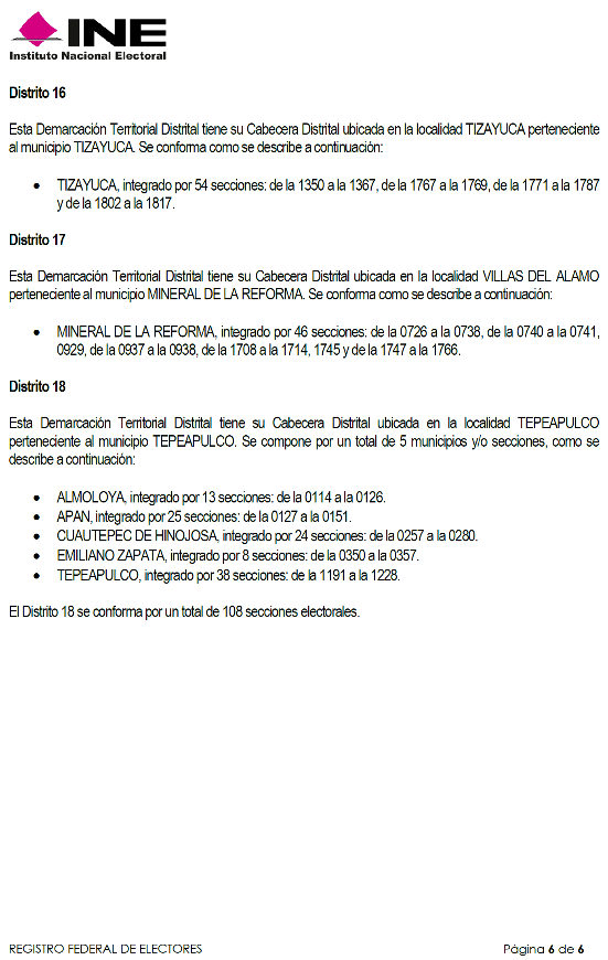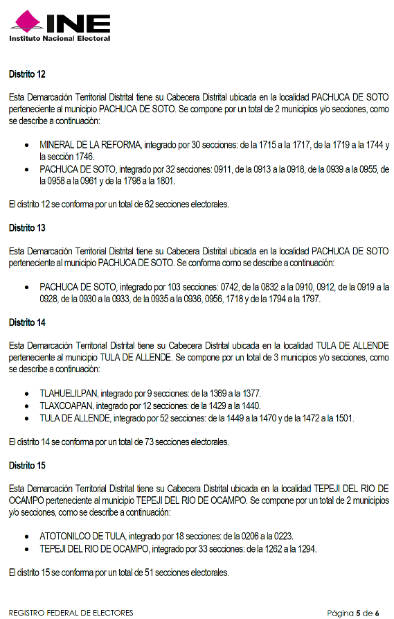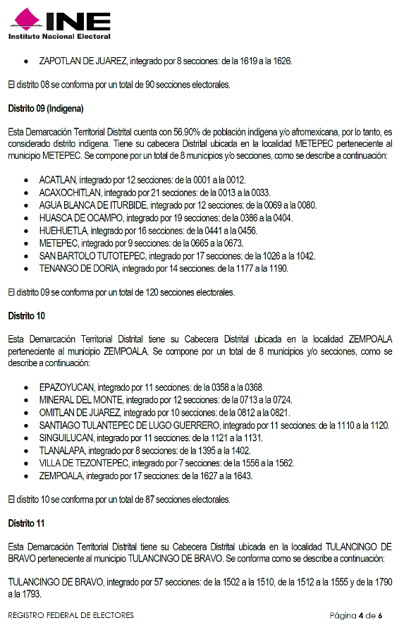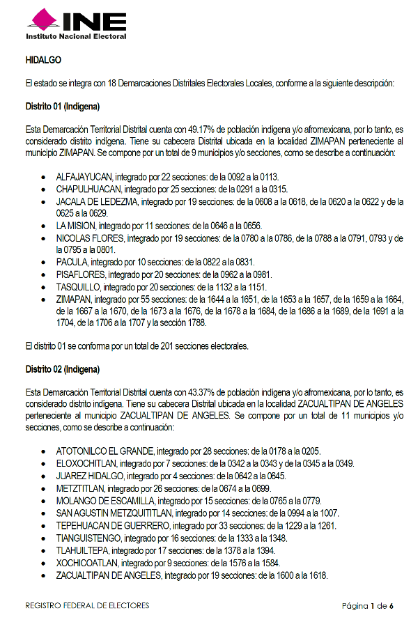 ACUERDO DEL CONSEJO GENERAL DEL INSTITUTO NACIONAL ELECTORAL POR EL QUE SE APRUEBA LA DEMARCACIÓN TERRITORIAL DE LOS DISTRITOS ELECTORALES UNINOMINALES LOCALES EN QUE SE DIVIDE EL ESTADO DE HIDALGO Y SUS RESPECTIVAS CABECERAS DISTRITALES, A PROPUESTA DE LA JUNTA GENERAL EJECUTIVA