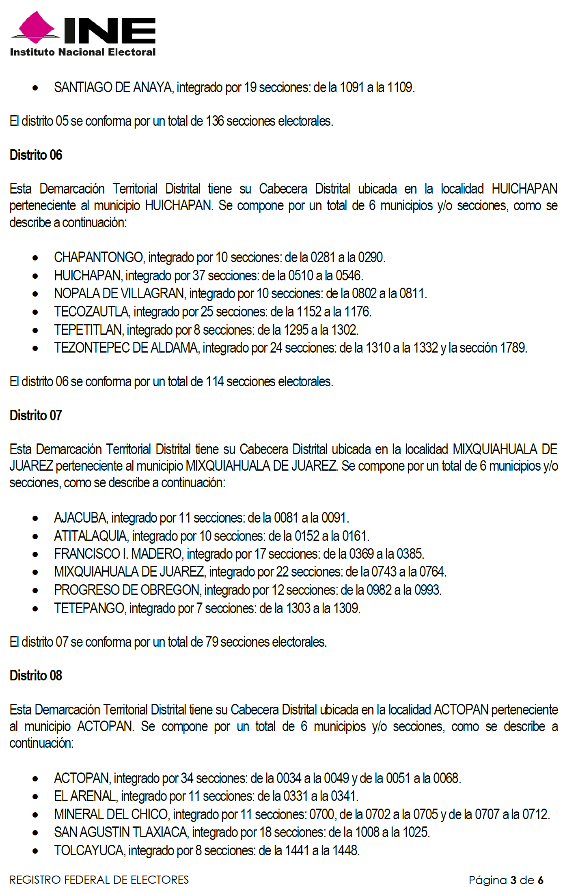 La demarcación territorial de los 18 distritos electorales uninominales locales en que se divide el estado de Hidalgo y sus respectivas cabeceras distritales queda conformada de acuerdo con el mapa y el descriptivo de distritos y cabeceras que se encuentran contenidos en el anexo 3, el cual acompaña al presente acuerdo como parte integral del mismo.