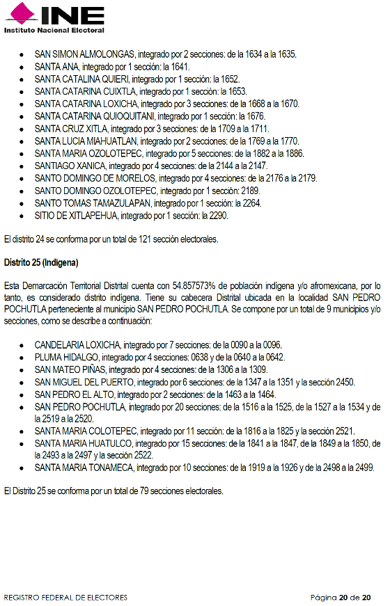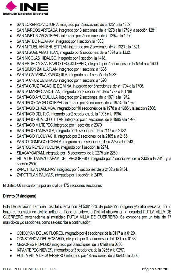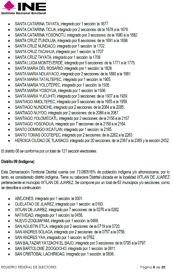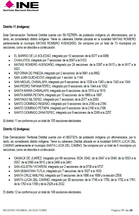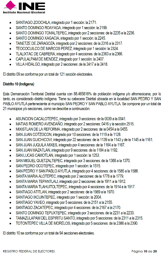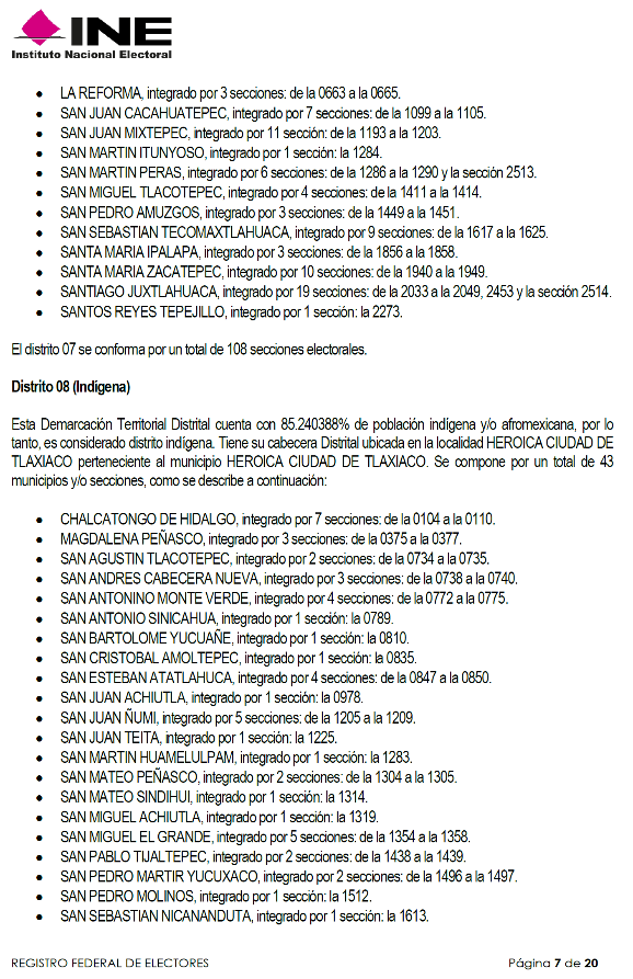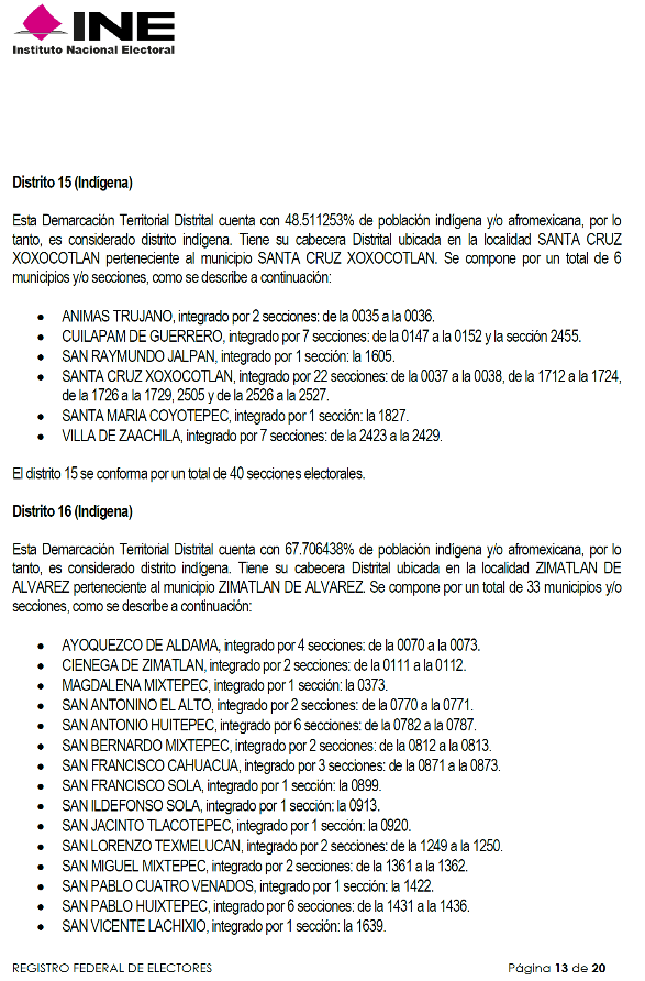 Los anteriores siete criterios permiten conformar distritos de manera lo más cercana posible a lo óptimo en términos de equilibrio poblacional, inclusión indígena y afromexicana, regularidad geométrica, integridad municipal, continuidad geográfica, facilidad de comunicaciones; no obstante, en ocasiones es indispensable visualizar otros aspectos como aquellos socioeconómicos, culturales y los accidentes geográficos.