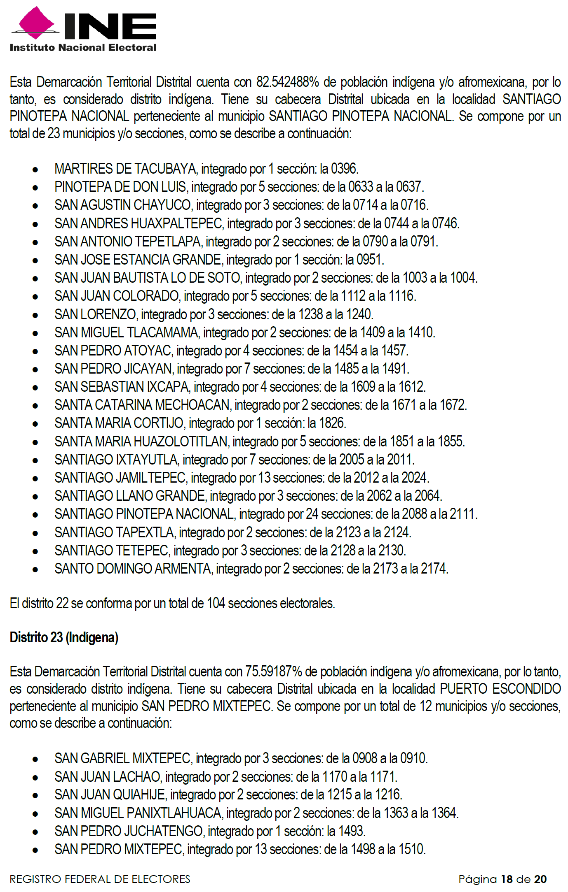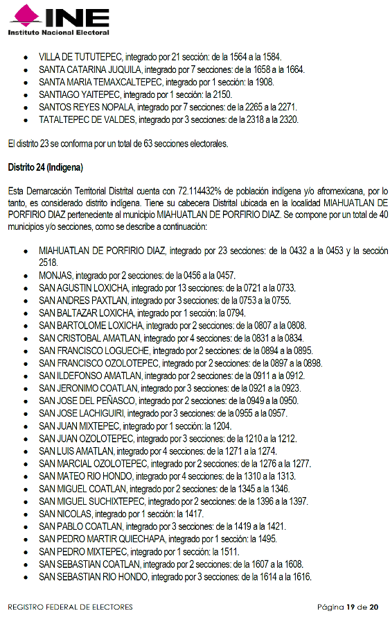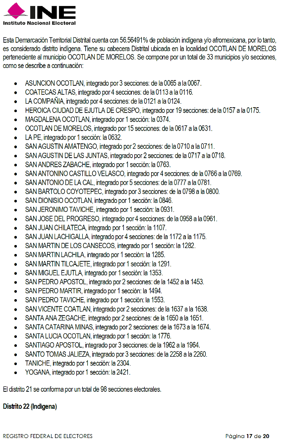 En virtud de lo expuesto, y de acuerdo con el PTDN21-23, se realizaron las actividades para la generación del proyecto de demarcación territorial de los distritos electorales uninominales locales en que se divide el estado de Oaxaca y sus respectivas cabeceras distritales, a propuesta de la JGE.