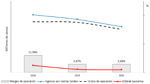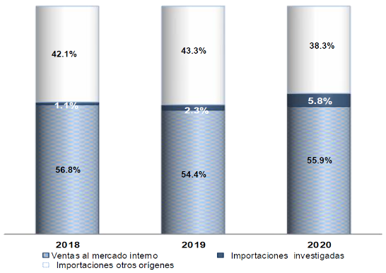 a. aumentaron 4% de 2018 a 2019 y disminuyeron 21% en 2020, lo que significó una caída del 18% durante el periodo analizado; este comportamiento se reflejó en una pérdida de su participación en el consumo nacional aparente en 3.9 puntos porcentuales durante el periodo analizado (+0.9 puntos porcentuales en 2019 y -4.8 en 2020) y 3.8 puntos en el consumo interno (+1.2 puntos porcentuales en 2019 y -5.0 en 2020), y