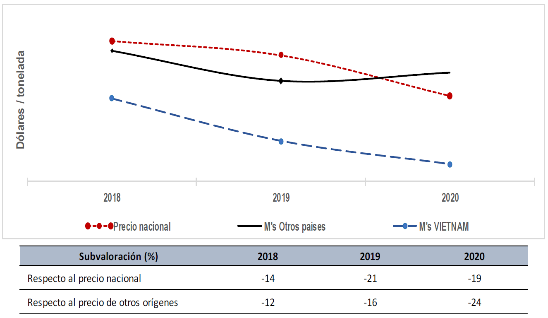 c. el precio promedio de las importaciones de aceros planos recubiertos originarios de Vietnam, se mantuvo por debajo del precio nacional en una magnitud de 14% en 2018, 21% en 2019 y 19% en 2020.