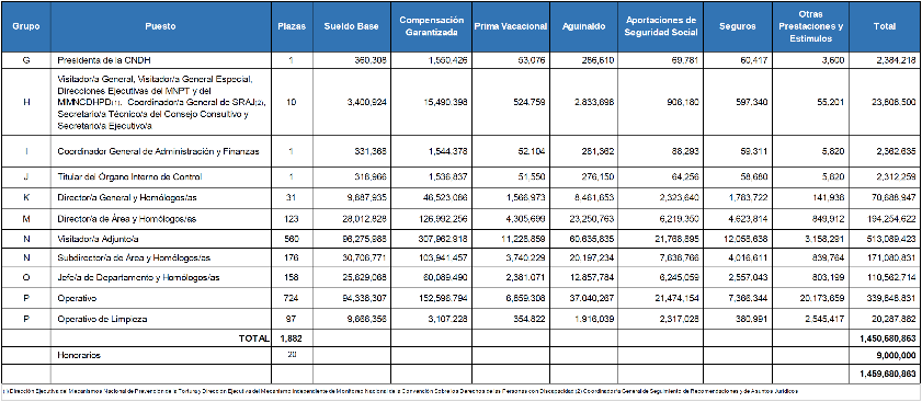 Al 15 de febrero de 2023 del total de la plantilla se cuenta con 147 plazas vacantes. La estructura de grupos, grados y niveles se desagrega en el Manual de Percepciones de las personas Servidoras Públicas de la Comisión Nacional de los Derechos Humanos para el año 2023. Conforme a las disposiciones aplicables las cifras contenidas en el cuadro están sujetas a la modificación de las remuneraciones que, en su caso, se otorguen las personas servidoras públicas durante el ejercicio fiscal 2023.