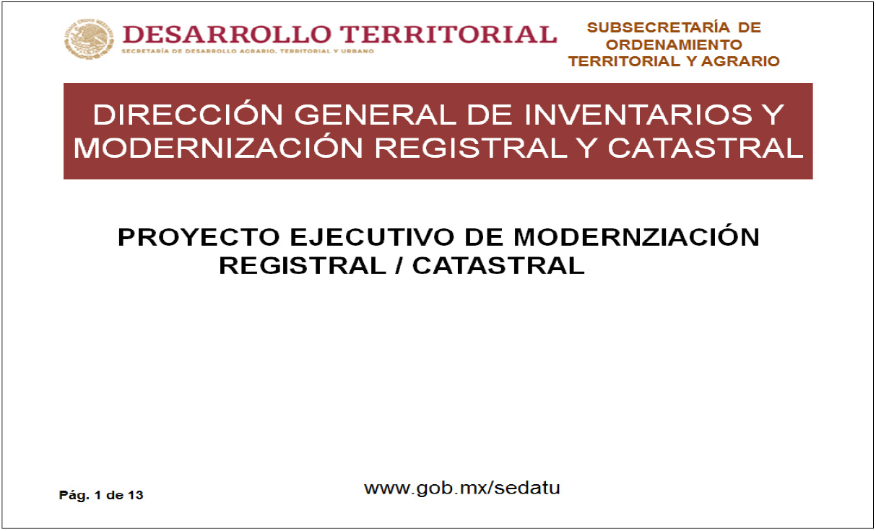 El Programa de Modernización de los Registros Públicos de la Propiedad inicia en el año 2007, operado inicialmente en la Secretaría de Gobernación; entre 2008 y 2009 estuvo a cargo de la Consejería Jurídica del Ejecutivo Federal y, de 2010 a 2012, en la Secretaría de Desarrollo Social; en 2011 se incluyó la vertiente Catastral, con el objetivo de vincular la información de carácter jurídico y la información física de la propiedad.