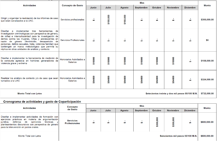 | 1 | Selección y contratación de persona física o moral con conocimientos en criminología, derecho, perspectiva de género, nuevas masculinidades y masculinidades alternativas que será la responsable de la coordinación de las actividades de la unidad de análisis y contexto. |