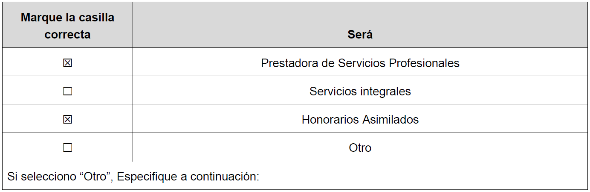 | Otro | No Aplica | Especifique en la Siguiente Sección |