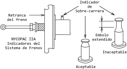 9.1.2.3.1. Este sistema no tiene una carrera de pistón mínima o máxima medible. La carrera excesiva está indicada por una señal de sobre - carrera ubicada en la cubierta del cilindro del freno. Cuando el indicador está excedido indica que la carrera del cilindro está más de 2 1/4 in (inaceptable); por lo que necesita atención. Ver Fig. 7.